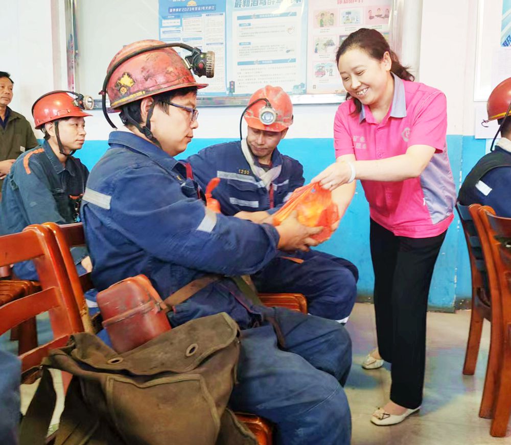 童亭礦女工在班前會(huì)為下井職工送去月餅和牛奶等中秋慰問品。