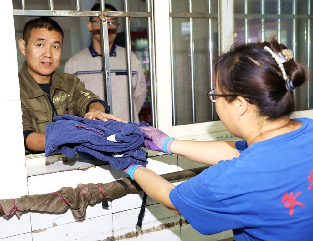 洗衣房女工將清洗干凈的工作服交給準(zhǔn)備下井的職工。