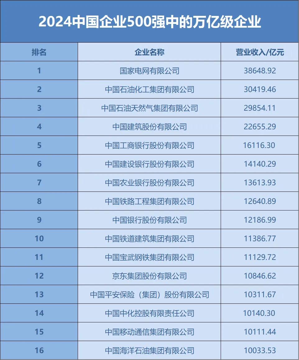 2024中國(guó)企業(yè)500強(qiáng)中,營(yíng)業(yè)收入超過1000億元的企業(yè)數(shù)量為253家,占比超過50%;有16家企業(yè)營(yíng)業(yè)收入超過了1萬億元。