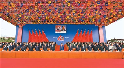 王滬寧發表講話。他說,1965年9月,在黨中央親切關懷和黨的民族政策光輝照耀下,西藏自治區宣告成立。這是西藏發展史上具有劃時代意義的大事,鞏固了西藏和平解放和民主改革的偉大成果,實現了西藏社會制度的歷史性跨越。60年來,西藏經濟社會全面發展,民族區域自治制度成功實踐,民族團結日益鞏固,各族人民生活蒸蒸日上,充分展現了中國共產黨領導的堅強力量,充分展現了我國社會主義制度的顯著政治優勢。