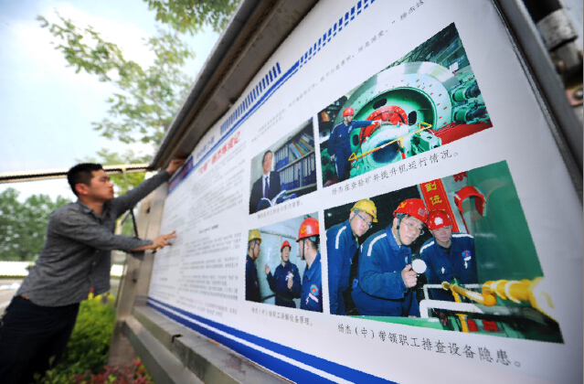 袁店二礦工作人員正在趕制典型人物燈箱牌。五一期間,該礦把“全國重大宣傳典型人物”楊杰的先進事跡制作成宣傳畫,展示在工廣主干道,引導職工學習先進、爭當先進。