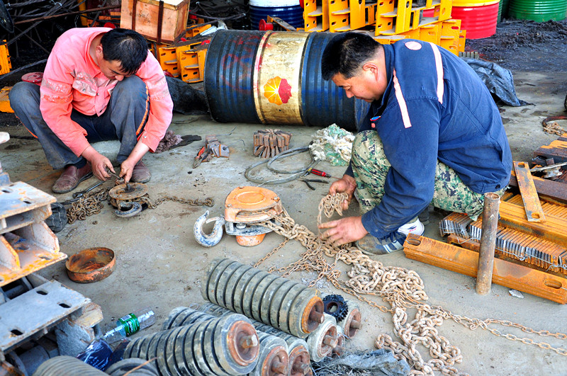 圖為煤三項目部機電隊職工正在對損壞的滑子進行修復。
