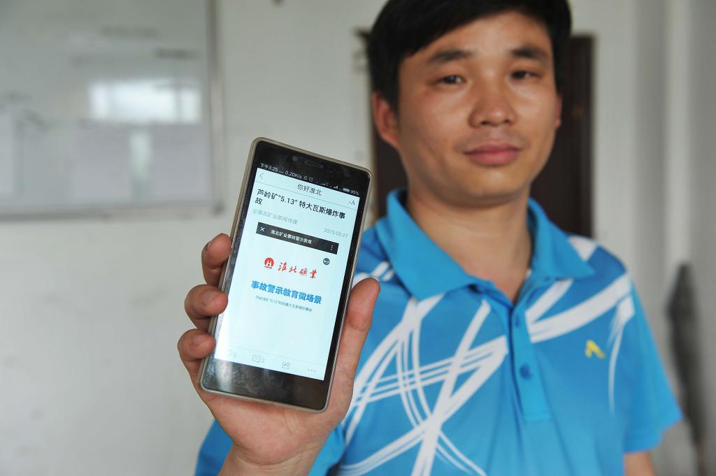 5月27日,青東煤業掘進一區青工孫飛在展示“你好淮北”手機客戶端上的事故警示教育微場景。該公司團委在青年“拇指族”中大力推廣“你好淮北”APP,讓青年能隨時隨地了解礦區新聞、學習知識,將安全“一手掌握”。