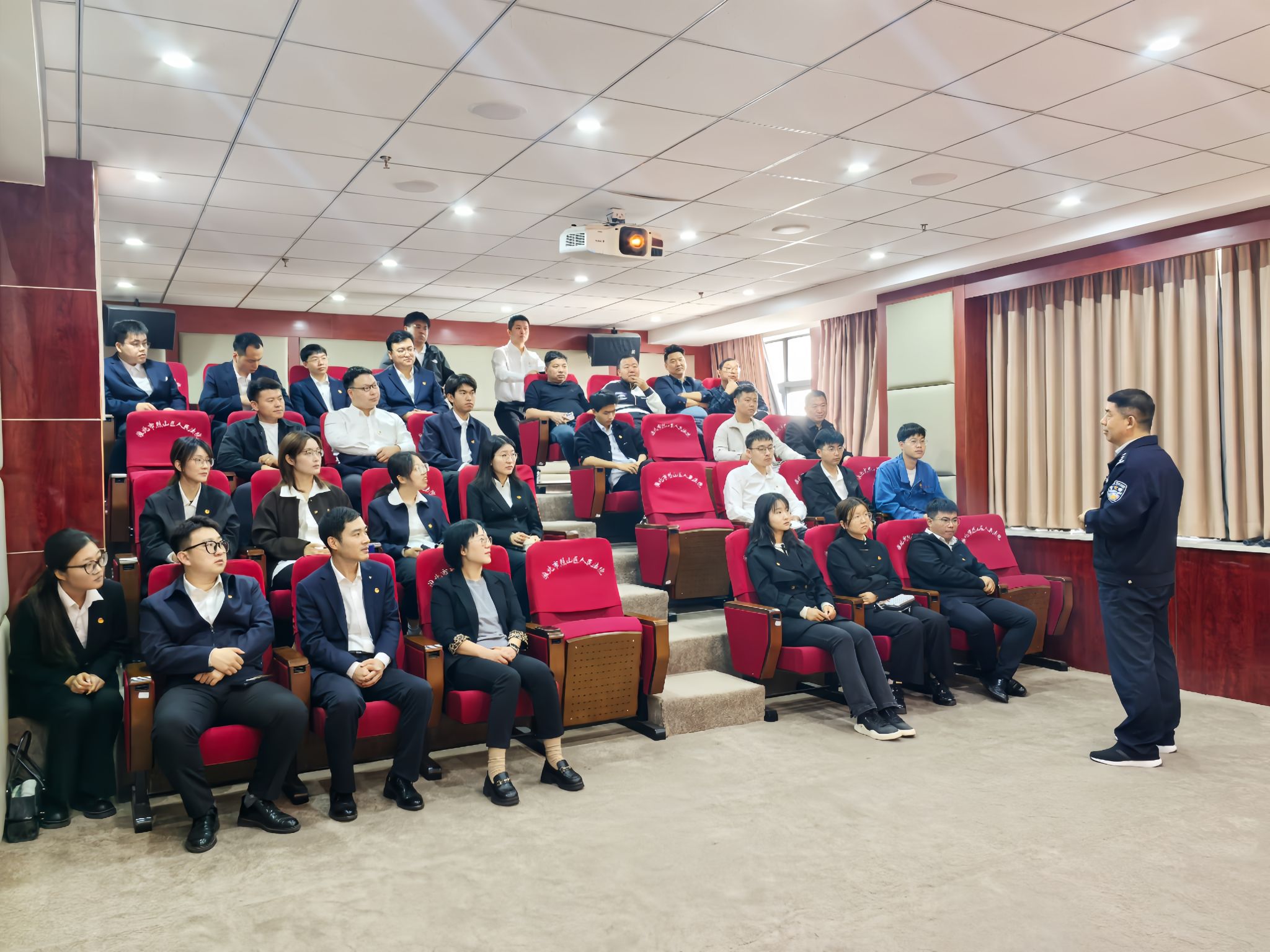 團員青年在工作人員的引導下依次參觀了訴訟服務中心、執(zhí)行事務中心、審判法庭、留置室等。法院工作人員從立案、審判等方面進行講解,使團員青年們了解了立案的程序、法庭的陳設、開庭的流程等,切實感受法庭的威嚴。