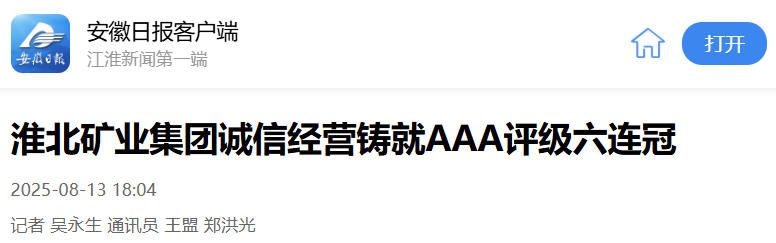 8月12日,安徽淮北礦業集團以優異成績通過中國煤炭工業協會信用等級現場評價,信用評價級別為AAA。至此,該集團已連續6屆獲評煤炭行業“AAA級信用企業”。