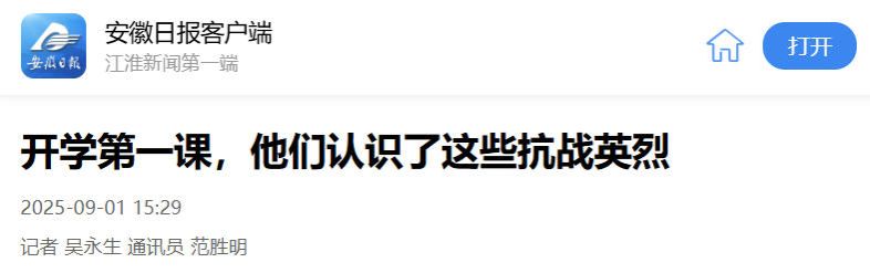 今年恰逢中國人民抗日戰爭暨世界反法西斯戰爭勝利80周年。開學首日,濉溪縣雙堆集鎮關工委邀請周楊將愛國主義教育融入“開學第一課”,引導小學生們銘記歷史、緬懷先烈,傳承弘揚偉大抗戰精神。