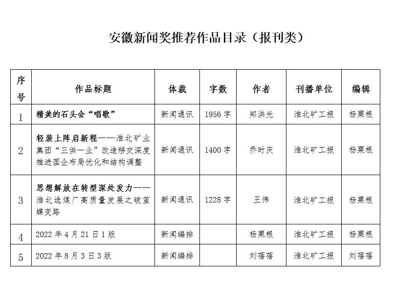 為認真做好2022年度安徽新聞獎報送評選工作,進一步提高報送評選工作的公開性、公平性和公正性,真正把好作品報上來、評出來,淮北礦工報社根據《安徽省新聞工作者協會關于開展2022年度安徽新聞獎評選工作的通知》精神和工作需要,成立評委會,并于2023年3月4日召開了評審會議,以無記名投票的方式評選出下列作品推薦參加2022年度安徽新聞獎評選。